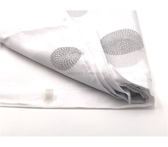 Cortinas en color blanco con elegante detalle en gris, nos garantizan una mayor privacidad durante nuestros días de camping.