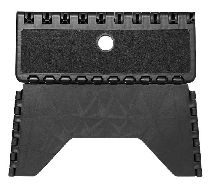 Peldaño de un escalón plegable acabado en color negro, ideal para caravanas, autocaravanas o furgonetas camper. Permite acceder al vehículo de forma cómoda y segura gracias a su estabilidad, mientras que su superficie antideslizante evita resbalones o caídas.
